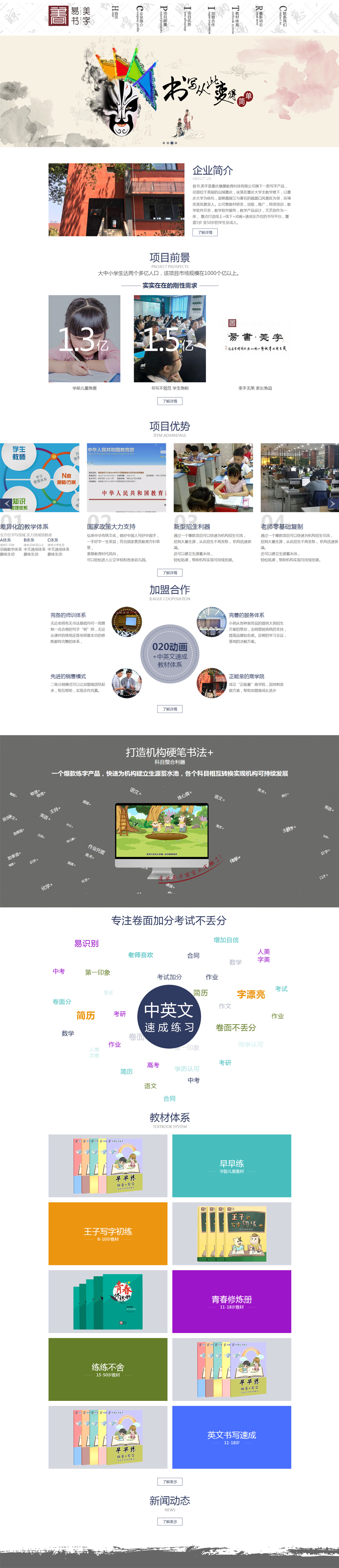 Project Description 易书.美字练字是重庆慧墨教育科技有限公司旗下一款写字产品,总部位于美丽的山城重庆,坐落 在重庆大学主教学楼下,以重庆大学为依托,面朝嘉陵江与著名的磁器口风景区为邻,环境优美 风景宜人。公司集教材研发,出版,推广,师资培训,教学软件开发,教学软件服务,教学产品 设计,文艺创作为一体,重点打造线上+线下+动画+速成全方位的书写平台,覆盖5岁至50岁的学 ... Official website address 辽源# I want to share